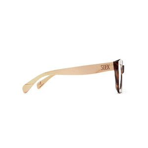 These popular 90s inspired readers are a mid-sized style that will suit most face shapes and sizes. Our Zahra magnifying readers are finished in a gorgeous toffee tort and fitted with white maple wood arms.